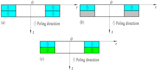 Piezoelectric QC actuators/sensors come in different configurations owing to differences in manufacturing; three types are depicted in Figure 10, which will be discussed in this section. Type (a) is an annular multilayer made of piezoelectric QCs that are poled to be along the positive z-axis. Type (b) unimorph consists of the first layer of piezoelectric QCs and the second layer of non-piezoelectric materials. Type (c) bimorph is a series bimorph with opposite poling pointing towards the interface of annular QC actuators/sensors, namely, the elastic constants and dielectric coefficients of the upper and lower QC layers are the same, while their piezoelectric coefficients are of opposite signs [30].