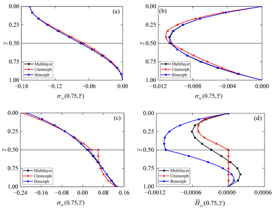 Figure 11 shows the variations in stress components in phonon and phason fields of different configurations of the annular QC actuator/sensor. In the presence of only the applied phonon stress along the thickness direction on the top surface of the actuator/sensor, the values of phonon stress (Figure 11a), phonon stress (Figure 11b), and phason stress (Figure 11d) at the top and bottom surfaces turned out to be zero. The behaviors of the above physical quantities matching the boundary conditions can somewhat evaluate the obtained results’ correctness. Observing from Figure 11a, owing to the same load on the top surface, the values of are found to be the same in all types of actuators/sensors. However, a little difference for the curve of in QC unimorph compared with the other two types of actuators is also presented in Figure 11a. It is clear from Figure 11b that the distributions of for different actuators/sensors present as parabolic functions. The maximum of in the QC unimorph is larger than that in the QC multilayer or QC bimorph. It is observed from Figure 11c that the radial component of the phonon stress exhibits a jump at the interface of the QC unimorph, which is induced by the different materials in each layer. A slight jump can also be observed from in the QC bimorph, while it is continuous at the interface of the QC multilayer. Moreover, the value of at the bottom surface of the QC multilayer is a little larger than that in the other types of actuators/sensors. It can be found from Figure 11d that the maximum of in the QC bimorph with oppositely poled layers is found to be nearly twice that in the QC multilayer with the same poling direction in both layers. Furthermore, the curve for in the QC multilayer is antisymmetric about the interface of the actuator/sensor, while the same phenomenon is not found in the other two types of actuators. It is clear that in the substrate of the QC unimorph is zero because of no phason field in aluminum.