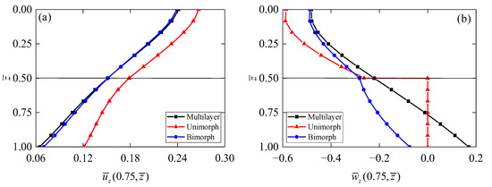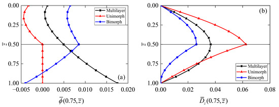 Figure 13 shows the distributions of electric potential and electric displacement along the thickness of the annular QC actuators/sensors with different configurations. Electric potential (Figure 13a) in the substrate of the QC unimorph came out to be zero as the substrate of the QC unimorph is made up of non-piezoelectric materials aluminum. It can be found that the sudden change in is induced in the interface of the QC bimorph, which is attributed to the opposite directions in polarization. In addition, the electric potential at the bottom surface is lower than that at the top surface. On the contrary, the electric potential at the bottom surface of the QC multilayer is larger than that at the top surface. Moreover, the electric potential difference of the QC multilayer is slightly larger than that in the QC bimorph. The electric displacements for different actuators/sensors are evaluated in Figure 13b. The maximum values of for all types are found at the interface of the structures. It is apparent that the maximum value of in the QC bimorph is smaller than that in the other two types. Figure 13b also indicates that the electric field intensity in the QC bimorph is stronger than that in the QC multilayer; this is mainly because the piezoelectric coefficients for different polarization materials are of opposite signs.