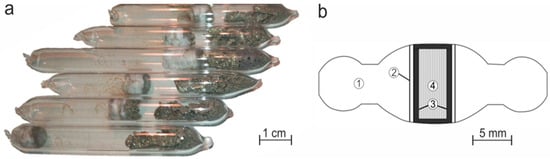 The procedure for the synthesis of both end members FeS (Tro) and α-NiS and Mss (FexNi1−xS): the prepared starting mixtures were placed in quartz glass ampoules with an outer diameter of 8 mm and a wall thickness of 1 mm (Figure 1a); then, the ampoule was evacuated and hermetically sealed. The experiments were carried out in horizontal resistance furnaces at T = 400 °C (24 h) at T = 500 °C (48 h), with two intermediate grindings of the charge in an agate mortar, and were again loaded into the furnace at T = 600 °C. The total exposure at temperature was 20 days. The graphical representation of the procedure for the synthesis is given in Figure S1 (Supplementary Information).