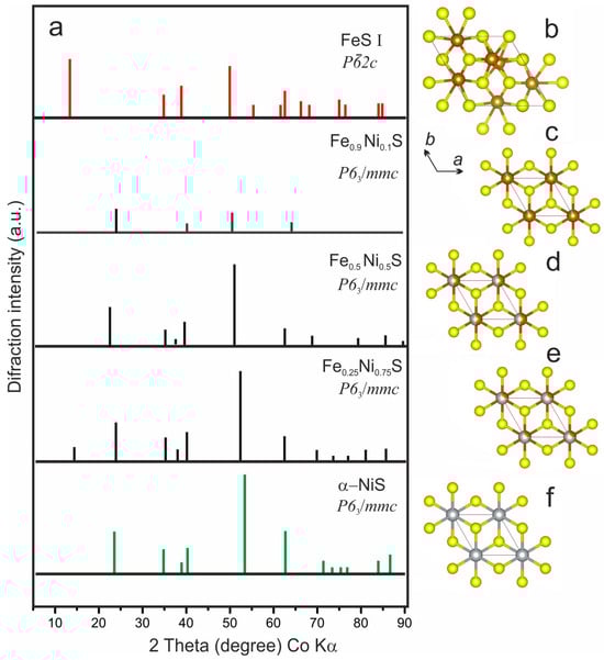(a) XRD pattern of HPHT FeS I and FexNi1−xS quenched experimental samples; (b) hexagonal crystal structure of troilite; the cell is shown with Fe in brown and S in yellow; (c–f) hexagonal crystal structure of Mss phases and α-NiS; the cell is shown with Ni in gray, Fe in brown, and S in yellow.