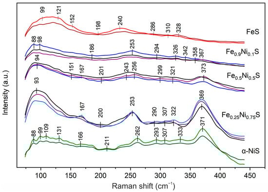 Raman spectra of troilite FeS I (redish lines) and nickel sulfide α-NiS (greenish lines) and different members of monosulfide solid solution FexNi1−xS (bluish lines). The spectra were collected from different areas of each sample. The differences in spectra for each sample are explained by the complexity of obtaining high-quality spectra of sulfides.