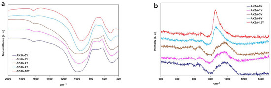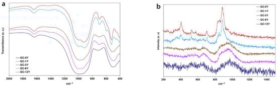 Figure 1a shows the FTIR and Raman spectra of the prepared glasses. These spectra present wide bands like other yttrium silicate glasses [8,19,20]. In the FTIR spectra shown in Figure 1, it can be observed that for the glass without Y2O3, the main peak that appears at about 1000 cm−1 changes to 930 cm−1 for the glass with a higher Y2O3 concentration. This peak is assigned to the Si-O-X bonds where X = Al, Zr, Y and the other elements also contribute to this observed decrease [21]. The other two peaks are due to Si-O bonds that appear at 798 cm−1 and 466 cm−1 in pure silica glass [21]; however, for the glasses prepared in this work, they appear at lower and higher frequencies, respectively. Thus, the first one is observed at 715 cm−1 and decreases to 670 cm−1, while the second one moves from 490 cm−1 to 507 cm−1. These changes indicate important structural modifications after the incorporation of Y2O3 in the glass network.