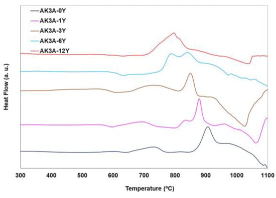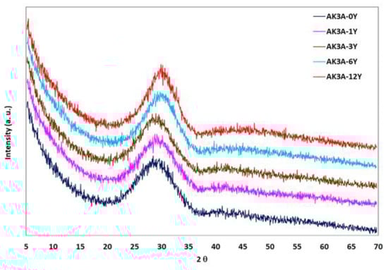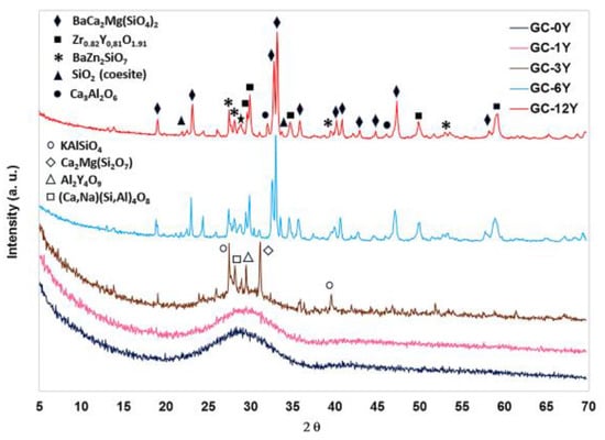 All the prepared glasses have been heat-treated to obtain glass–ceramic materials at temperatures higher than those at which the exothermic peaks in the DTA curves appear. They were treated at 930 °C for 10 and 30 min for developing all possible crystals, but similar results were obtained at both treating times, and only the characterizations carried out for glasses heated for 30 min will be presented. The obtained glass–ceramic materials containing 0%, 1% and 3% of Y2O3 were transparent, while those containing 6% and 12% of Y2O3 were opaque with a white color. This result indicates the formation of crystalline phases in the 6% and 12% Y2O3 glass–ceramics; however, all samples would be expected to be crystallized because they had been treated at higher temperatures than those at which crystals appear, according to their crystallization peaks determined by DTA (Figure 4). These glass–ceramics have been characterized as commented on below.