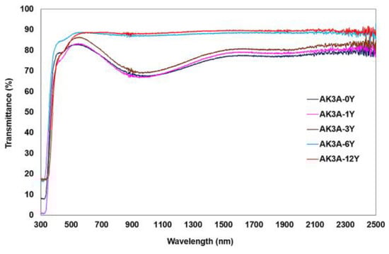 These glasses have also been characterized by UV–vis–NIR spectroscopy in the transmittance mode (Figure 3). In these spectra, the two above-mentioned behaviors can also be observed: one for the glasses containing 0–3% Y2O3, where the transmittance presents a hump at about 550 nm reaching 82–88%, then decreases in the 800–1000 nm region and increases again, reaching 80% of transmittance. The second behavior is found for those glasses containing 6% and 12% of Y2O3 that reach 90% of transmittance between 550 and 2500 nm. These changes are due to Y2O3 that modifies the glass network structure, as has been observed by Raman and FTIR spectroscopies.