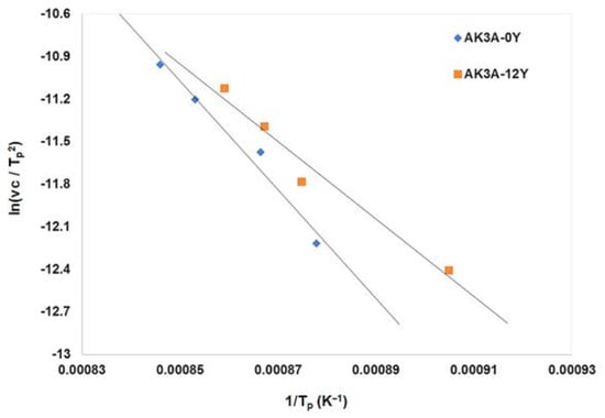 Firstly, the kinetics of the crystallization of the above discussed glasses has been determined by DTA analysis. The DTA curves have been measured at four heating rates (vc = 5, 10, 15 and 20 °C·min−1) and the peak temperatures have been determined for the glass samples of AK3A-0Y and AK3A-12Y, i.e., with 0% and 12% of Y2O3, respectively. Although there are several methods for calculating the activation energy (Ea) of the crystallization process, the most-used Kissinger’s method [25] follows the following equation: