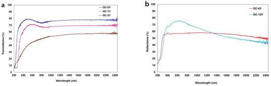 UV–vis–NIR spectra of glass–ceramics crystallized at 930 °C for 30 min. (a) Transmittance of GC-0Y, GC-1Y and GC-3Y samples and (b) reflectance of GC-6Y and GC-12Y samples.