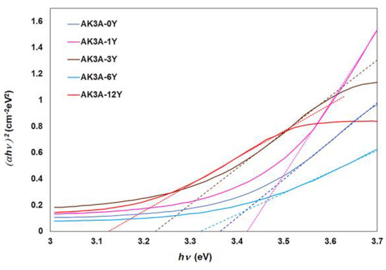 The UV–vis–NIR spectra have been used for determining the differences in the optical properties between the Y2O3 glasses and their respective glass–ceramics. From the UV–vis spectral region of Figure 3 and Figure 8, the band-gap (Eg) values have been calculated. From the transmittance spectra (Figure 3 and Figure 8a), the optical absorption coefficients α(ν) can be determined at different wavelengths by using the following equation [30]: