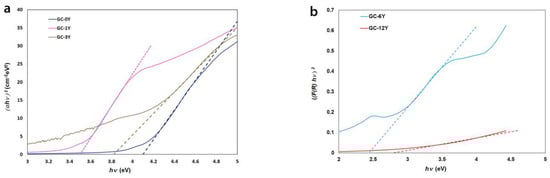 For the UV–vis transmission spectra of Figure 3 and Figure 8a, the plot of α(ν)h.ν vs. hν is used for the calculation of Eg, as is shown in Figure 12. At the same time, from the reflectance spectra of Figure 8b applying Equation (7), the corresponding Eg values for the opaque glass–ceramic materials have been determined, as can be observed in Figure 13. In both figures, we observe a linear increase in α(ν) or F(R∞) with increasing energy, and the intersection point of the linear fit in the x-axis has been used to estimate the Eg values that are collected in Table 3. For those glasses containing Y2O3, a decrease in Eg with the Y2O3 concentration is observed, and this corresponds to the incorporation of Y3+ as a network modifier. In the case of the glass–ceramics, for those that present transparency, i.e., GC-0Y, GC-1Y and GC-3Y, and for that GC-6Y with opacity, the Eg values also tend to decrease with the increase in Y2O3 in their compositions; however, for that GC-12Y which is also opaque, its Eg value presents a little increase. It is also observed that for the opaque glass–ceramics, their Eg values are lower than those of the respective glasses with similar Y2O3 concentrations. On the contrary, the transparent glass–ceramics present higher Eg values than their counterpart glasses with similar Y2O3 concentrations. This result indicates that during the heat treatment carried out to crystallize the prepared glasses, some NBOs have turned to BOs while crystals are formed, and for Y2O3 concentrations of 6% and 12%, the above-mentioned phase separation has continued forming NBOs.