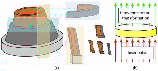 In order to facilitate a comparative analysis of the structural and mechanical characteristics of the experimental nozzle-shaped samples obtained via different regimes, samples were cut for structural studies, mechanical testing, and thermal diffusivity assessment. The methodology employed for the excision of experimental coupons utilizing electric discharge machining (EDM) is illustrated in Figure 2a.