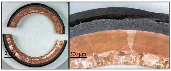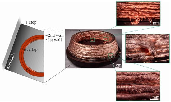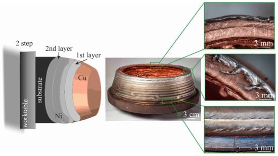 Following the establishment of two vertical copper walls, a rotation was initiated to facilitate the continuation of printing with the nickel wire positioned perpendicular to the substrate. Accordingly, an experimental nozzle-shaped sample was grown additively in accordance with the initial methodology, as illustrated in Figure 4. Defects of the cracking type were observed in the vicinity of the substrate. In this instance, the occurrence of cracking can also be attributed to the existence of a temperature gradient, which is the consequence of the different melting temperatures of the two materials, and the heat dissipation characteristics of the water-cooled table.