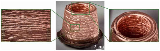 In Mode I, copper layers were deposited in two rows, resulting in the formation of a truncated cone with a diameter of 135 mm and a height of 90 mm. At this step, it is possible to discern the presence of defects on both the internal and external surfaces of the sample. In consideration of the physical and thermal properties of copper (high thermal diffusivity), a reduction in heat input was applied. Consequently, the heat input, specifically the beam current responsible for the changes in the heat input, exhibited similar values for both the first and second copper vertical walls (Table 1).