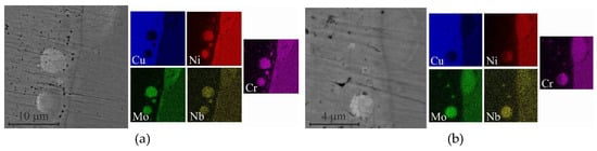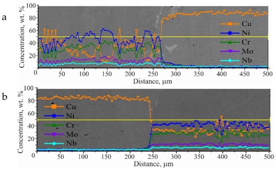A gradient zone, up to 20 microns thick, can be discerned on the graph of the dependence of elemental composition on the distance to the substrate. This zone exhibits a distinct composition of nickel alloy, differing from the nominal composition, and a notable concentration of copper. When two wires, comprising nickel and copper, are fed simultaneously, a gradual transition in chemical composition is observed, followed by a sudden change, which forms a gradient zone. Some observed variation in the elemental composition is attributable to the fact that the phases within the matrix are partially trapped during the analytical process. The initial area is linked to the emergence of primary copper droplet fractions within the nickel matrix. The second region pertains to the formation of nickel alloy inclusions within the copper matrix. Both areas are distinguished by the inhomogeneity of microstructure and phase distribution (Figure 8).