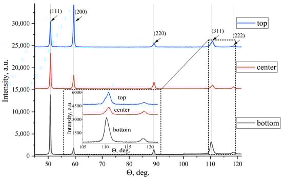 X-ray diffraction analysis was conducted on a DRON-7 diffractometer (Bourevestnik, Saint-Petersbourg, Russia) utilizing cobalt Kα radiation. The thermal diffusivity was determined on a Netzsch LFA 457 (Selb, Germany) microflash device on samples of square cross-section with a side of 10.0 ± 0.02 mm and a thickness of 3.5 ± 0.5 mm by the laser flash method, in which the lower part of the sample was heated by an unfocused pulsed laser beam. Concurrently, the temperature increase over time was gauged on the upper surface of the specimen with the aid of an infrared detector (Figure 2b). Subsequently, additional analysis of the temperature evolution over time was conducted, employing the mathematical models offered by the software provided with the instrument.
