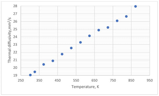 The identified features of microstructure exert an influence on the mechanical properties. As previously stated, the printing process resulted in the formation of a homogeneous and defect-free structure for both the main components and the boundaries between them. A comprehensive strength analysis of additive manufacturing products necessitates the consideration of the physical and mechanical characteristics that are contingent upon the specific additive manufacturing technology and process parameters employed. The aforementioned approach enables the identification of critical values for process parameters, thus facilitating the choice of appropriate manufacturing configuration for specific products. The microstructure that is formed subsequently to solidification is the determining factor for the mechanical characteristics of the clad metal. Thermal diffusivity measurements were conducted on experimental nozzle-shaped samples during isothermal holding at the designated temperatures. The total duration of measurements at each temperature was limited to 30 min. The heating process between isothermal holding temperatures was conducted at a rate of 3 °C/min in a static argon atmosphere. In calculating the thermal diffusivity, the change in the thickness of the sample under study with temperature changes was not considered (Figure 12).