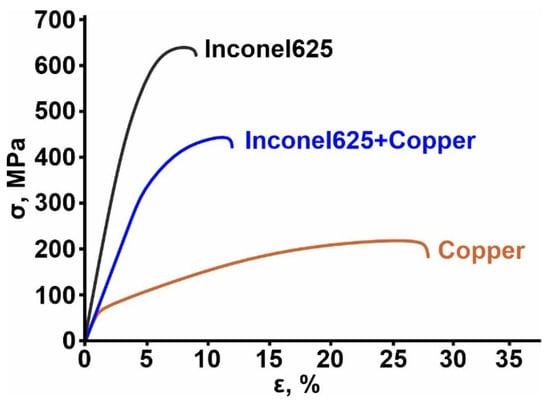 The mechanical properties of the obtained bimetal samples are summarized as follows: the 0.2% proof strength σ0.2 = 325 MPa, σT = 450 MPa, and ε = 6.5%. Apparently, their mechanical properties exhibit higher strength than those of pure copper samples and lower strength than those of Inconel 625 samples obtained by the same WEBAM route. It is important to note that the observed reduction in ductility can be attributed to the rapid crystallization of the material that occurs when nickel is deposited upon pure copper. This phenomenon, coupled with the rapid cooling that ensues, contributes to the diminished ductility of the resulting material.