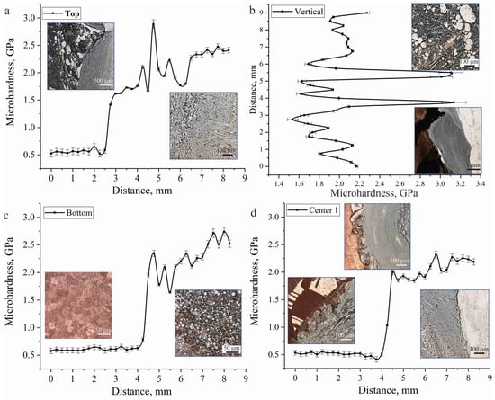 Microhardness with optical images areas of the relevant experimental samples of nozzles based on nickel alloy and copper: (a)—upper part of the sample on the last layers of the nozzle; (b)—lower part of the sample on the last layers of the nozzle; (c)—line along the transition boundary from the first layer to the last layers of the nozzle; (d)—central part of the sample on the last layers of the nozzle.