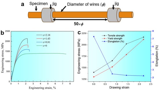 (a) Schematic of the tensile specimens; (b) tensile stress–strain curves of wires with the different true stains; (c) tensile strength, yield strength and elongation vs drawn strains.