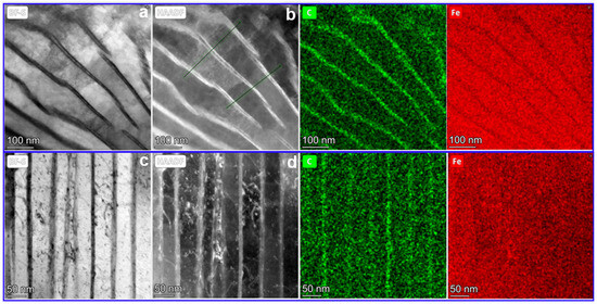 TEM images and corresponding EDS mapping of wires before and after cold-drawing: (a,b) ε = 0; (c,d) ε = 2.18.