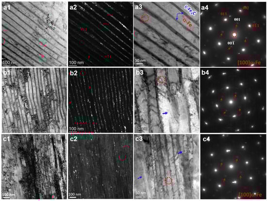 The TEM images of pearlitic wires with varying ε are shown in Figure 4. Figure 4(a1,a2) depicts the BF and DF images of α–Fe and θ–Fe3C, respectively. Figure 4(a4) displays a SADP of the region indicated by a circle in Figure 4(a3). The presence of superlattice {001} spots remarked by arrows in a [100]α-Fe zone axis implies that ordered structures are formed in α–Fe. Several studies indicate that the ordered carbon configuration in α–Fe [19,20] and austenitic steels [21] can lead to SRO formations. In the SRO B2–NiAl phase, the superlattice reflections are also observed at {001} spots in an SADP along the [100]α-Fe axis [22]. There are a lot of references about SRO in FCC and BCC alloys/phases validated by additional spots in SADP [22,23]. In Figure 4(a4–c4), the diffraction spots of θ–Fe3C with low crystallographic index almost disappear along the [100]α-Fe zone axis.