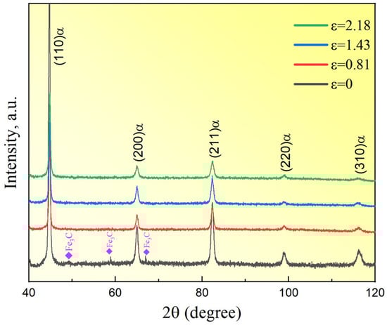 Figure 6 shows XRD patterns of cold-drawn wires with the different ε. The α–Fe diffraction peaks of the (110), (200), (211), (220), and (310) planes can be identified according to bcc crystal patterns. But the α–Fe diffraction peaks show broadening, which is resulting from a refinement of pearlitic lamellae and an increase in dislocation density during the cold-drawing process [26]. At ε = 0, diffraction peaks from θ–Fe3C can be observed, while these peaks almost disappear with the increase of ε. Deformation-induced θ–Fe3C dissolution and θ–Fe3C amorphization may be responsible for the disappearance of θ–Fe3C diffraction peaks [7,26].
