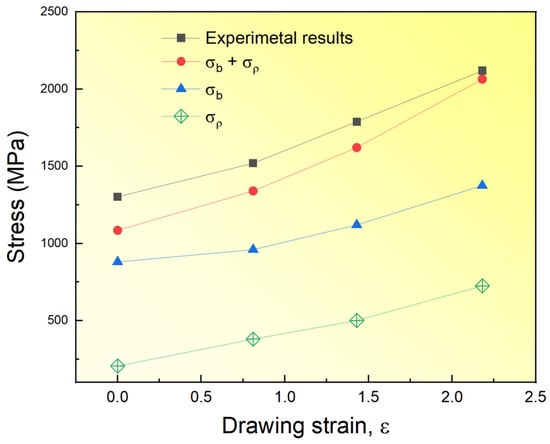 where α is a constant of 0.24; M is the orientation factor, about 1.84 for the strong <110> of Fe [28]; G is the shear modulus (77.5 GPa [2]); b is the Burgers vector, 0.248 nm for α–Fe; and ρ is the dislocation density, which is based on XRD patterns, as show in Figure 7b. The calculated σb and σρ based on Equations (5) and (6), respectively, together with the measurements of yield stress are shown in Figure 8. Both σb and σρ increase with ε. σb is much higher than σρ at all strains, which means that boundary strengthening is prominent in cold-drawn pearlitic steel wires. This feature is consistent with other results [25]. The combination of σb and σρ is a little lower than experimental results at different ε. This trend indicates that there is a solution strengthening mechanism beside boundary strengthening and dislocation strengthening in the cold-drawn pearlitic steel wires.