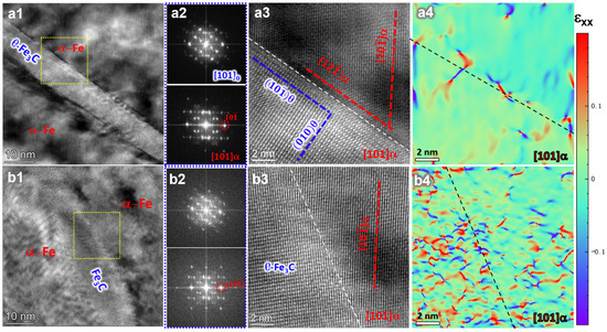 HRTEM images of α–Fe/θ–Fe3C interfaces at: (a) ε = 0, (b) ε = 2.18. (a2,b2) The FFT patterns of α–Fe and θ–Fe3C phases in (a1,b1), respectively; (a3,b3) magnified view of the yellow box areas in (a1,b1); and (a4,b4) the corresponding strain maps along the [100]α-Fe axis calculated by Strain++ software V1.8 for HRTEM images in (a3,b3).