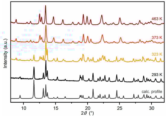 In addition, temperature-modulated PXRD experiments were performed to reveal the structural changes that the original structure of [CnZnBr3]·MeOH undergoes when heated from room temperature to 463 K (Figure 1). Even at a slight heating to 323 K, the PXRD pattern changes, and in addition to the peaks corresponding to the [CnZnBr3]·MeOH phase, additional peaks belonging to a new phase are detected. The correlation of these observations with the TG/DTA experiment on the isostructural compound [CnZnCl3]·MeOH suggests that the structural transformation is related to the removal of the solvent molecule (methanol) from the crystal structure. According to PXRD, the solvent-free form is stable up to 463 K.