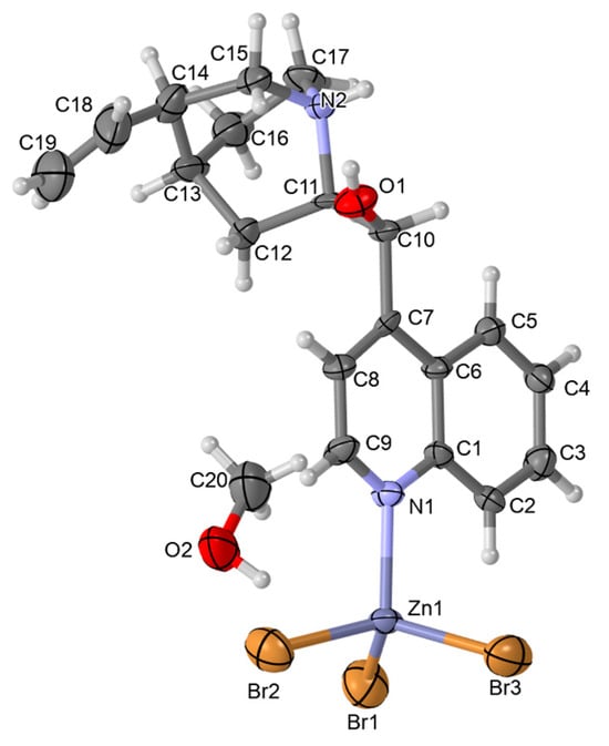 In the study carried out, the compound [CnZnCl3]·MeOH was prepared in the form of single crystals through a modified literature method by layering a methanol solution of cinchoninium chloride with an acetonitrile solution of zinc(II) chloride. This method allows the preparation of high-quality single crystals in very high yield. The choice of solvent for dissolving the starting compounds played a decisive role in crystallization as well as in the chemical composition and crystal structure of the products obtained. According to the PXRD analysis, the prepared cinchoninium–trichlorozinc(II) compound corresponds to the structure deposited in the Cambridge Structural Database (CSD) under the reference code JORQIQ (Supplementary Figure S3) []. By replacing zinc(II) chloride with zinc(II) bromide in the reaction with cinchoninium chloride (CnCl), a new mononuclear coordination complex of the formula [CnZnBr3]·MeOH was obtained. The compound crystallized as a solvate with a methanol molecule in the crystal structure and was isostructural with the compound [CnZnCl3]·MeOH [].