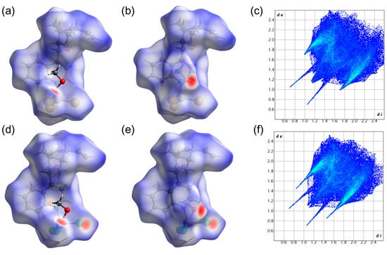 The Hirshfeld surfaces and 2D fingerprints of the Hirshfeld surface were calculated using the program Crystal Explorer []. The normalized contact distances dnorm were mapped onto the generated Hirshfeld surface, with red regions indicating close intermolecular contacts (negative dnorm), blue regions indicating longer contacts (positive dnorm), and white regions with intermolecular contacts corresponding to the van der Waals radii of the atoms in contact (dnorm = 0).