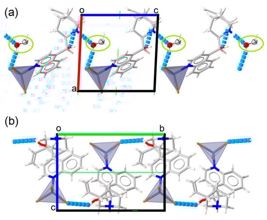 The crystal packing of [CnZnBr3]·MeOH is determined by hydrogen bonds between the halide atoms and the hydrogen atoms of the hydroxyl group and the protonated quinuclidine group of the cinchoninium. The methanol molecule mediates the hydrogen bonds between two [CnZnBr3] complexes, and this type of interaction forms a cooperative hydrogen bonding chain along the c-axis (Figure 4a). Besides participating as a proton donor and acceptor in the cooperative hydrogen bond, methanol serves as an additional proton donor for the C–H···Br contact propagating along the a-axis. Along the polar b-axis, there is a hydrogen bonding chain between the two [CnZnBr3] complexes (Figure 4b), which results from a hydroxyl-O–H···Br contact. In addition to these contacts, the two C–H···π interactions also stabilize the crystal packing along the polar axis. Details of these interactions can be found in Supplementary Tables S3 and S4. The intermolecular potentials calculated in Mercury using the UNI force field calculation [,] are in good agreement with the Hirshfeld surface analysis [], which predicts stronger contacts for the [CnZnCl3]·MeOH compound. Each [CnZnCl3] complex forms two contacts of −40.5 kJ mol−1 and −33.9 kJ mol−1 with two neighboring [CnZnCl3] complexes and one contact of −29.1 kJ mol−1 with the methanol molecule. In the [CnZnBr3]·MeOH compound, the mentioned contacts reached energy levels of −38.2 kJ mol−1, −32.2 kJ mol−1 and −28.4 kJ mol−1, respectively.