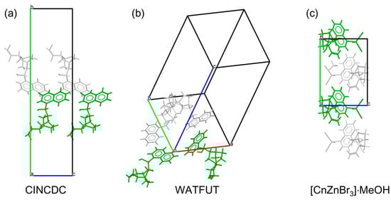 In orthorhombic structures with higher symmetry (CINCDC [], FACFEU [], WATFUT []), aromatic stacking interactions have a stabilizing and directing effect on the crystal packing in addition to hydrogen bonds (see Figure 6a,b). In polar crystal structures (JORQIQ [], WUXQIP [], [CnZnBr3]·MeOH), these types of interactions are absent (Figure 6c). Another observation is that in non-polar structures, cinchoninium molecules appear as doubly protonated and isolated cations, whereas in all polar structures with cinchoninium, the quinolone nitrogen is coordinated to the metal center and the organic fragment is part of the complex. The cinchoninium molecules probably have more freedom of movement in the structures in which they occur as isolated cations, and their packing is determined by stacking interactions. In the structures where cinchoninium is part of the metal complex, the molecule is more rigid and other types of interactions, especially hydrogen bonds, are more pronounced. If the influence of the inorganic moiety is taken into account, structures with trihalogenometalate contribute more to the overall dipole moment of the complex, while the tetrahalogenometalate anions are non-polar in ideal tetrahedron geometry.