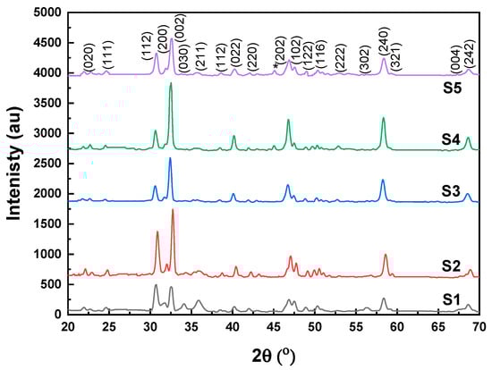 The XRD patterns shown in Figure 1 indicate that all samples (S1–S5) exhibit good crystallization and the presence of the main diffraction peaks of LSMO monoclinic structure with the space group P21/n, which is consistent with the monoclinic structure of a similar compound [30,40,44]. Additionally, a comparison with the reported orthorhombic structures with a Sr content above 0.30 or with changes in the oxygen content revealed that the obtained diffraction peaks are inconsistent with the orthorhombic structure [14]. Moreover, we could not find any noteworthy secondary lines that might indicate the presence of impurities in the samples S1, S2, and S3. However, a secondary line close to 2θ = 45° of a lower intensity can bee observed in the case of the samples S4 and S5, which implies the solubility limit of Zn and Co co-doping at Mn sites is reached in these samples. This behavior indicates that co-doping of Zn+Co up to 0.20 substitutes Mn sites well. The unusual change in structure is due to the deviation of β and γ angles from 120° to between (90.54–90.92°) and (90.43–90.62°), respectively, although the Mn3+–O–Mn4+ bonds are close to 180° for optimal double exchange [45].