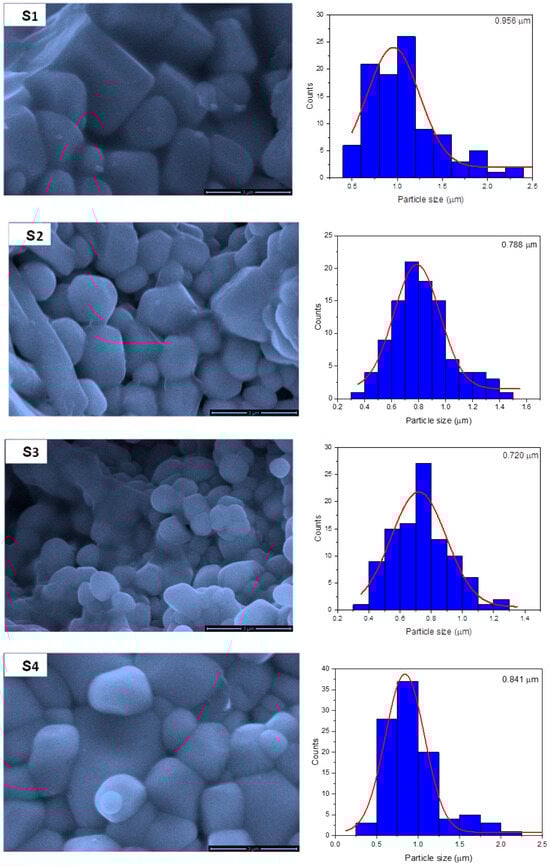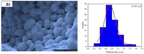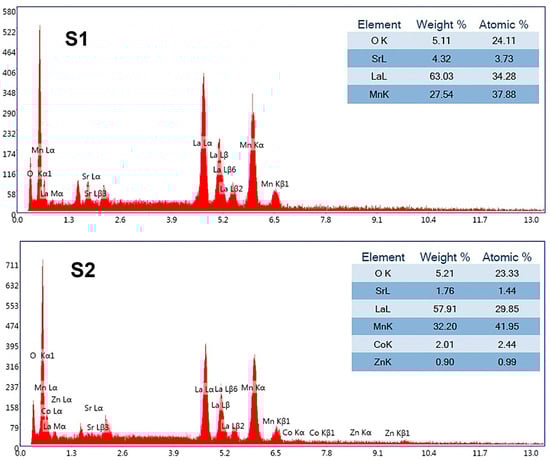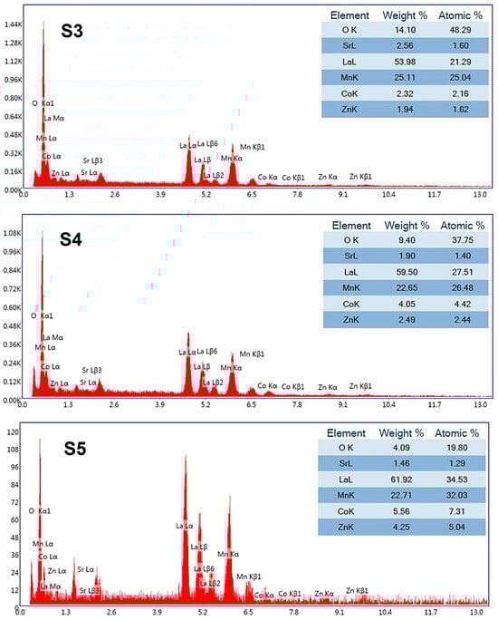 No noticeable secondary phases or additional contaminants were detected at the grain boundaries in the SEM images presented in Figure 2, and the grains are well uniformly distributed over the matrix structure, but with a mixture of large and small sizes, such that smaller grains are connected with larger grains. Most of the formed grains have a spherical-like shape, and some of them are agglomerated, indicating a strong magnetic interaction moment of the perovskite. A higher concentration of co-doping (0.20) may create a few points of defects in the matrix structure via the oxidization of Mn3+/Mn4+, leading to a more conductive nature. The average grain size distribution (DSEM) shown in Table 2 was generally decreased by co-doping from 956 nm for S1 to its minimum value (788 nm) for S3. The biggest and smallest sizes formed for S1 and S3, respectively, indicate the great effect of adding co-doped ions to the crystal lattice of the host perovskite. According to the values of the ionic radii between the host and dopants, the co-doping could cause the shrinkage of the unit cell, in turn decreasing the size of the grains, which would be beneficial in many electronic storage devices. The EDS graphs shown in Figure 3 indicate that although the weight percentages of Zn, Co, and O are generally increased by co-doping, the Mn was decreased. Interestingly, the amount of oxygen is generally increased by the co-doping and reaches its maximum value for S3 and S4, but it decreases to its minimum for S5.