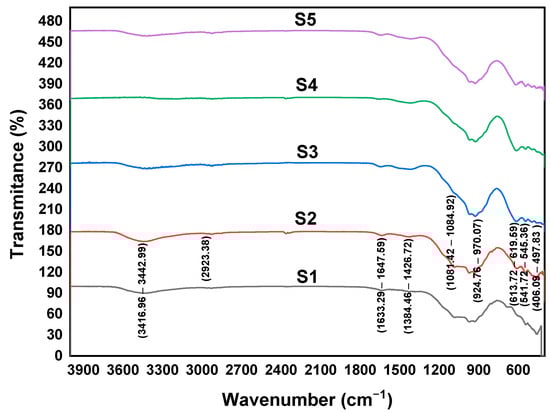 The samples’ FTIR spectra are displayed in Figure 4. Although MnO6 is known to have six vibrational modes and an octahedral symmetry, only two of these modes are visible in the infrared spectra [1]. Bending and stretching vibrations can result from changes in bond angles, internal motion, or alterations in the length of the Mn–O–Mn molecule. The absorption bands observed between 3416.96 and 3442.99 cm−1 correspond to the stretching and bending modes of H-O-H in adsorbed water molecules [49]. The absorption peak at 2923.38 cm−1 is present only in the pure sample and is attributed to the stretching vibrations of C–H groups. Meanwhile, the bands between 1633.29 and 1647.59 cm−1 are associated with the C=C stretching and the carbonyl group (C=O) resulting from the bending vibrational modes of hydroxyl radical groups [2]. However, the bands near 3400 and 1600 cm−1 are absent in sample S3. The bands between 1384.46 and 1426.72 cm−1 are attributed to the bending vibrations of C–H groups [50]. The absorption bands ranging from 924.76 to 1084.92 cm−1 are attributed to the symmetric and asymmetric stretching modes of oxygen, which are likely to influence the adsorption process. The broad peak at 605.28 cm−1 indicates the presence of a metal–oxygen bond, which subsequently forms a MnO6 octahedral structure [9,50]. These findings suggest that small amounts of water molecules and carbon dioxide may have been absorbed from the surrounding environment [51]. The bands in the range of 541.71 to 619.59 cm−1 are associated with the stretching mode (νs) of the Mn-O or Mn–O–Mn bonds, while the bands between 406.09 and 497.83 cm−1 correspond to the bending mode (νb) of the Mn–O–Mn bonds [52]. However, the variation in the wave number indicates a change in the energy needed to modify the Mn-O bond within the more distorted octahedron, where a geometric transition has taken place to alleviate or alter the induced strain.