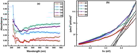 Figure 5a illustrates the absorbance (A) as a function of the wavelength (λ), where A increases as λ decreases. All samples exhibited a distinct absorption edge in the UV range, which is attributed to the inorganic nature of the LSMO compound. Typically, direct transitions account for the weak absorption peaks observed around 260 nm [63]. A notable shift in this behavior is linked to the variation in the excitation energy necessary for electron transition. Below 250 nm, the absorbance (A) increases, suggesting a shift in carrier concentration states within the band structure. Compared to S1, the co-doped samples S2, S3, and S4 show higher absorbance values; however, for S5, the absorbance decreases at lower wavelengths, falling below the absorbance of S1. This behavior supports the notion that co-doped samples up to 0.10 are suitable for optoelectronic applications such as solar cells. The Eg can be determined using Tauc’s equation [64,65]:
