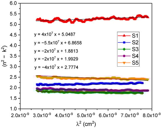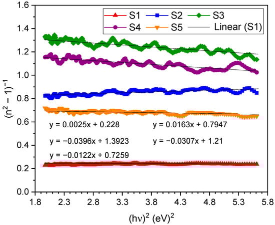 where c, e, εo, m*, N, and ϵL denote light speed, electron charge, free space permittivity, effective mass of an electron, free carrier concentration, and lattice dielectric constant, respectively. The values of ϵL and (N/m*) were obtained from the linear fit of (n2 − k2) against λ2, as shown in Figure 6 and Table 4. The 0.025 of co-doping enhanced the (N/m*) from 3.69 × 1046 to 6.77 × 1046 (g·cm3)−1, but it decreased with increasing co-doping content up to 2.46 × 1046 (g·cm3)−1 for S4, and then increased for S5 to 4.92 × 1046 (g·cm3)−1. So, the (N/m*) was increased for S2 and S5 to values more than that of S1. However, similar behavior was observed by co-doping, and it reached the highest value of 6.77 × 1046 for S2. The Wemple-DiDomenico (WDD) single oscillator model, employed for obtaining the single and dispersion oscillator energies (Eo and Ed), is given by [74,75]