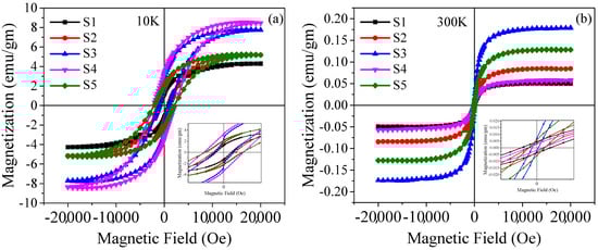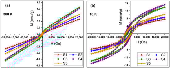 The samples’ magnetic hysteresis loops at 300 and 10 K are displayed in Figure 8a,b, respectively. The samples S1–S5 show a mixture of paramagnetic and ferromagnetic behaviors at 300 K. The bulk of M-H curves’ domains are ferromagnetic despite their positive slopes and extremely small hysteresis area at low field. They exhibit a distinct blend of ferromagnetic and paramagnetic behavior when T decreases to 10 K. On the other hand, the M-H curve at 10 K exhibits the opposite behavior, suggesting that LSMO samples have several magnetic phases. Moreover, the bigger observed pinning centers generated at lower temperatures are the reason for the significantly greater magnetization values at 10 K compared to 300 K [78].