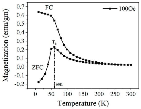 The magnetization as a function of temperature for S3 measured in the field-cooled (FC) and zero-field-cooled (ZFC) configurations at an applied magnetic field of 100 Oe is shown in Figure 10. The FC and ZFC curves for S3 show an obvious bifurcation, which indicates the existence of magnetic nanoparticles with a blocking temperature of Tb = 60 K, smaller than that of S1 where the magnetic nanoparticles blocking temperature of Tb = 80 K. The FC and ZFC in the whole temperature range of 10–300 K suggest that there is no existence of an order–disorder phase transition, which reveals that the Curie temperature (TC) is higher than 300 K. However, the ZFC curve shows the phenomenon of a negative magnetization (or magnetization sign reversal) at low temperature due to the dominance of diamagnetic contribution at low temperature. Such behavior has been reported elsewhere [3,89,90,91,92,93], and it is mainly explained by the coexistence in LSMO of ferromagnetic order and magnetically inhomogeneous regions made up of spin clusters with a lower oxidation state. Similar behavior was observed in the other samples as well.