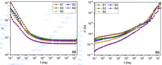 where C and C0 are the capacitances of the sample and the empty cell (C0 = ε0A/d), respectively. ε’’ is the imaginary part of ε. Figure 11a plots the relationship between ε′ and frequency (f) and shows that ε\ steadily declined as f is decreased up to 1 MHz, the point at which ε\ saturated. The higher values of ε\ at lower f clearly indicate the presence of interfacial polarization caused by the polarization of the space charge. Elevating f beyond 1 MHz may result in a dipolar polarization, where the carriers are unable to track the field reversal [96]. However, the addition of co-doping helps to decrease the ε\ of the samples S1 to S4, followed by a slight increase in the case of S5 to be higher than those of S4, inconsistent with the space charge polarization explanation provided by Maxwell–Wagner [97]. However, the co-doped samples can be used in the devices of nonlinear optics and high-frequency antennas [98,99].
