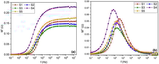 The real and imaginary components of the electric modulus (M\, M\\) for the samples are plotted against f in Figure 12a,b. It is seen that M\ increased with increasing f for all samples and then saturated above 10 kHz. As compared to S1, M\ was decreased for S2 and S3, followed by a significant increase for S4, and then decreased to be lower than that of S4. The same behavior is observed for the curves of M\\, but with different relaxation peaks (RPs). For example, M\\ shows RP at 353 Hz for S1, but is shifted to a low f of 168, 199, and 65.2 Hz for S2, S3, and S4, followed by a shift to 137 Hz for S5. However, the RP values of the samples indicate a non-Debye relaxation type and have substantially shorter spin-relaxation periods than expected between 100 and 150 ns, which is highly advantageous for spintronic devices [69].