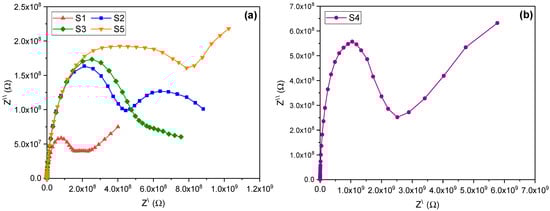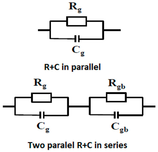 Figure 13a,b presents the Cole–Cole (Nyquist) plots of Z\\ as a function of Z\ for all samples. The plots are single semicircles followed by straight lines or arcs of positive or negative slopes at the tail of the curve for S1, S3, S4, and S5. In this case, the frequency (f) is unable to distinguish the impedance of the grains from their boundaries. Therefore, it can be modeled using a parallel combination of a resistor (R) and a capacitor (C), as shown in Figure 14. In contrast, for sample S2, two successive semicircles spanning the frequency range are observed, indicating that the applied frequency range is sufficient to separate the conductivity of the grains from that of their boundaries. This behavior can be further represented by a series combination of two parallel RC circuits, as depicted in Figure 14. The radius/diameter of each plot is employed to obtain the impedances of grains and their boundaries as Z\(g), Z\(gb), as summarized in Table 6. It was found that the values of Z for S1 gradually increased until they reached their maximum values for S4, and then decreased for S5, which is in direct correlation with those obtained for Ms. However, the opposite is true for the example. The parallel combination’s series resistance (RB) and effective capacitance (Ceff) are given by [104,105];
