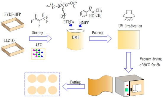 The PEL composite solid electrolyte membrane was prepared using a UV-curing method, as illustrated in Figure 1. First, 2 g of PVDF-HFP, which had been dried for 24 h at 60 °C, was placed in a drying oven. This was then mixed with an appropriate amount of lithium perchlorate (LiClO4) and dissolved in DMF solvent, stirring until a transparent, homogeneous solution was obtained. The temperature was maintained at 60 °C while LLZTO was added and stirred thoroughly for 12 h. Next, the cross-linking agent ETPTA and the photoinitiator HMPP were added, and the mixture was stirred for 5 min. The uniform slurry was then poured into a polytetrafluoroethylene (PTFE) mold. Finally, the mixture was subjected to UV light at an intensity of 1200 mW cm−2 for 1 min to form a semi-wet membrane, which was then placed in a vacuum-drying oven for 6 h to obtain the PEL composite solid electrolyte. The resulting PEL membrane was cut into small discs with a diameter of 18 mm and stored in a glovebox (with H2O < 0.01 PPM and O2 < 0.01 PPM).