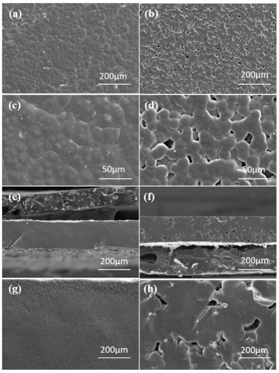 The prepared PVDF-HFP-based composite solid polymer electrolyte morphology was characterized using scanning electron microscopy (SEM). Figure 3a,c,e,g show the surface and cross-sectional SEM images of the PE membrane. The PE surface exhibits polymer agglomeration without pore structures, resulting in a relatively smooth surface, essential for maintaining good contact between the membrane and the electrodes. After further adding LLZTO to the electrolyte membrane, the electrolyte surface developed abundant pores. These pores facilitate the accommodation of the necessary electrolyte and provide more lithium-ion (Li+) pathways, thereby enhancing lithium ion transport efficiency (Figure 3b,d,f,h).