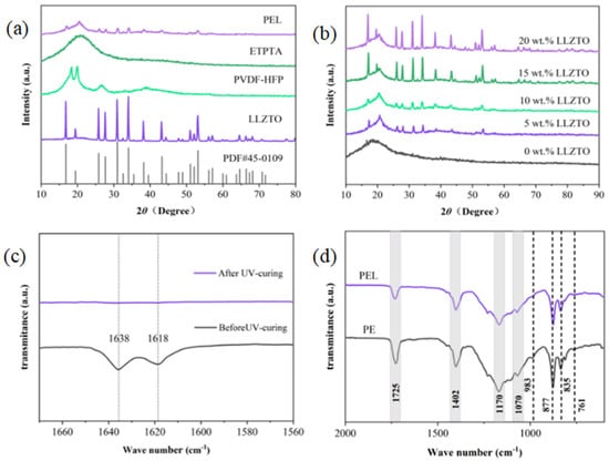 (a) X−ray diffraction spectra of LLZTO, PVDF−HFP, ETPTA, and PEL; (b) X−ray diffraction spectra of adding 0−20 wt.% LLZTO; FTIR infrared spectrum characterization diagram; (c) PE and PEL before and after UV photofixation; and (d) PE and PEL.