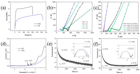 (a) Stress–strain plot of PE and PEL; EIS at room temperature; (b) PE electrolyte with different amounts of ETPTA added; (c) PEL electrolyte with different amounts of LLZTO added; (d) the linear sweep voltammetry of PE and PEL. Electrochemical impedance spectroscopy (EIS) and timing current method (CA) test the lithium-ion migration number of the assembled Li/Li symmetrical cells (e) PE and (f) PEL.