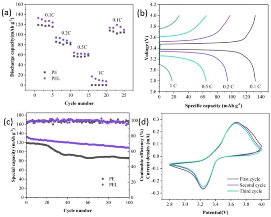 To evaluate the impact of the inorganic filler LLZTO on the rate performance of solid-state electrolytes, standard CR 2025-coin cells were assembled using two types of electrolytes: PE and PEL. We conducted electrochemical tests at room temperature, measuring discharge rates ranging from 0.1 to 1 C. As shown in Figure 6a, PEL demonstrated superior capacity compared to PE at discharge rates of 0.1 C, 0.2 C, 0.5 C, and 1 C. After high-rate cycling at 1 C, the PEL battery retained a capacity of approximately 20 mAh g−1, while the PE battery failed to function, dropping to 0 mAh g−1. This indicates that the modified solid electrolyte offers more favorable ionic pathways for high current discharge. Figure 6b presents the initial charge–discharge curves of the LFP/PEL/Li solid-state battery within a voltage range of 2.8 to 4.0 V at different rates. The curves are stable across varying rates, demonstrating good rate performance. Figure 6c compares the cycling performance of the batteries at a current density of 0.1 C. The initial discharge capacity of the LFP/PE/Li solid-state battery was 119 mAh g−1, which decreased to 86 mAh g−1 after 100 cycles, resulting in a capacity retention rate of 72%.