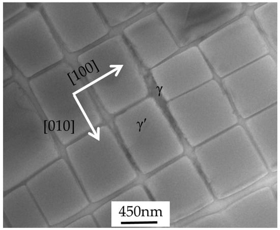 The TEM microstructure morphology of the (001) crystal plane of the alloy after the heat treatment is shown in Figure 1. It shows that the alloy is composed of two γ′/γ phases. The size of the two γ′/γ phases are about 400–450 nm and 60–80 nm. The cubic γ′ phase is regularly arranged along the [100] and [010] directions, as shown with the arrows. And, there are no dislocations in the observed range.