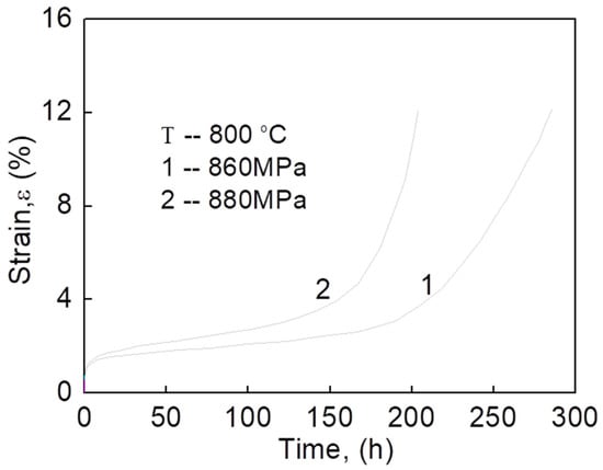 The creep curves of the alloy were tested under the stress conditions of 860–880 MPa at 800 °C, as shown in Figure 2. It shows that the creep can be divided into initial, steady, and accelerated stages. The strain rate is larger in the initial and accelerated stages and smaller in the steady stage. The curves 1 and 2 in the figure are the creep curves of the alloy, measured at 860 MPa and 880 MPa, respectively. The strain rates during the medium-term steady state are 0.0069%/h and 0.0148%/h, and the creep life of the alloy is 286 h and 204 h, respectively.