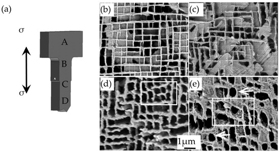 The SEM microstructure of the alloy in different regions after creep fracture at 800 °C/860 MPa is shown in Figure 3. Figure 3a is a schematic diagram of the sample observation area after the creep fracture. Figure 3b–e show the microstructures of different regions of the sample, where the dark contrast region and the light contrast region are the γ′ phase and γ matrix, respectively. Thereinto, the normal orientation of the observation surface is in the [100] direction.